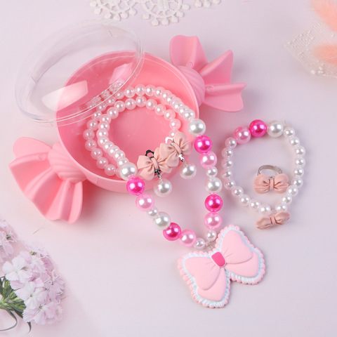 Bebek kız kolye takı seti şeker boncuk reçine plastik inci bilezik yüzük yay kolye çocuk şeker kutusu hediye